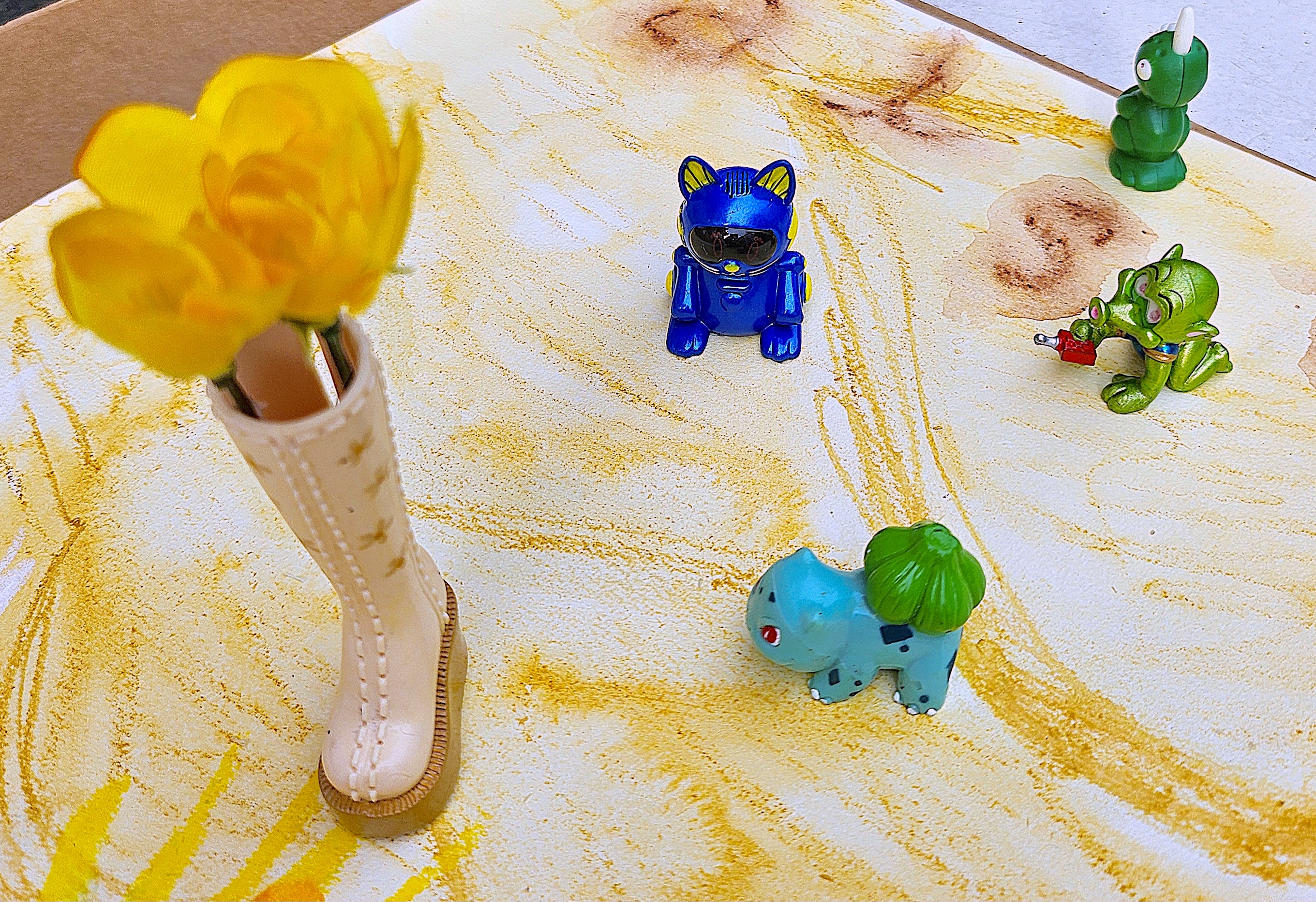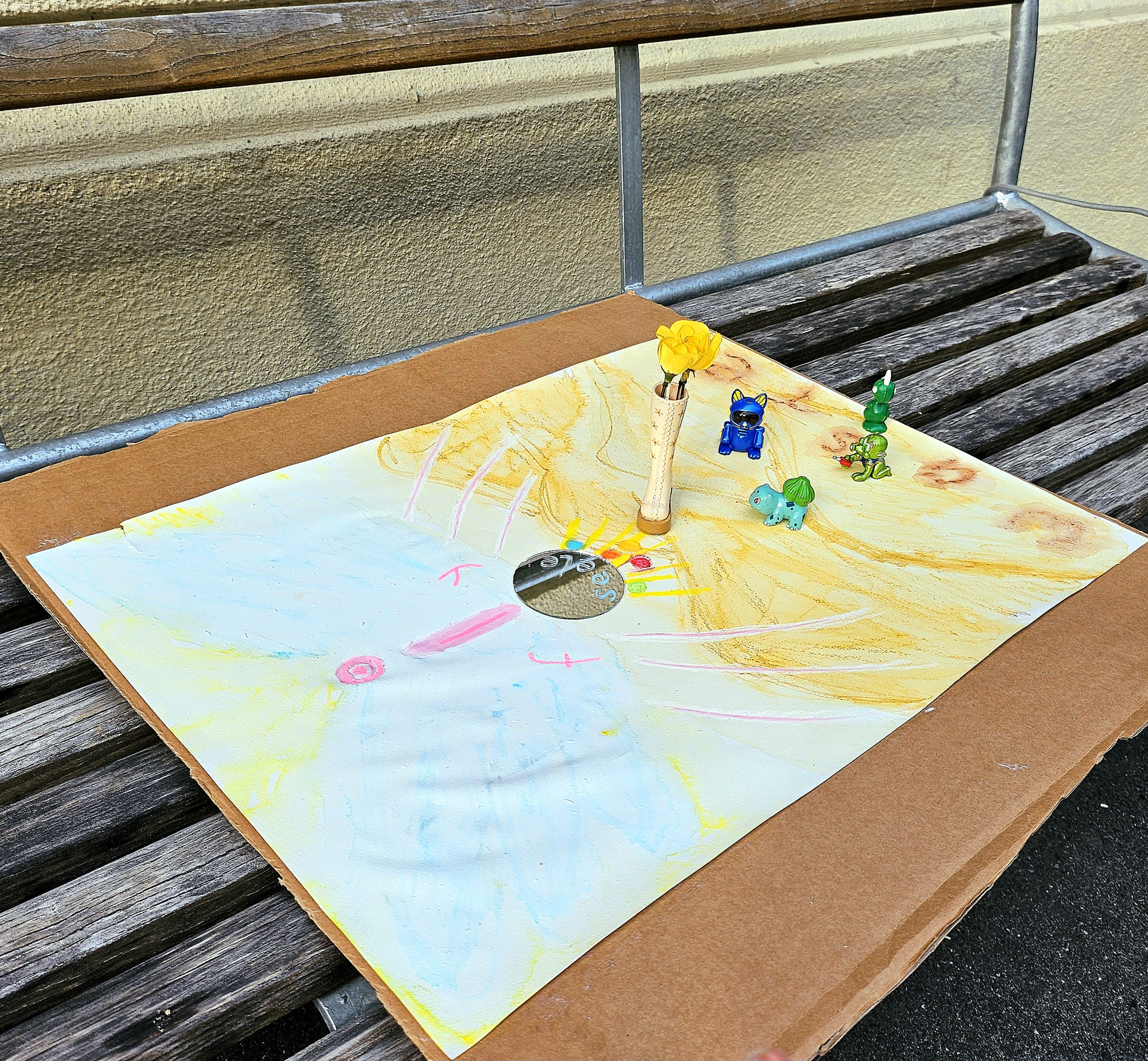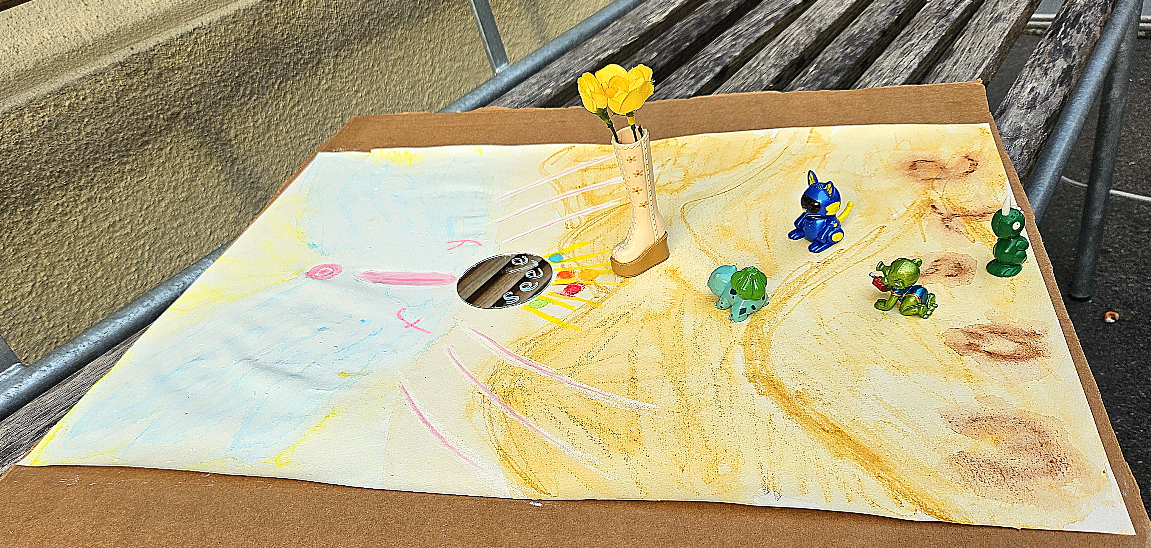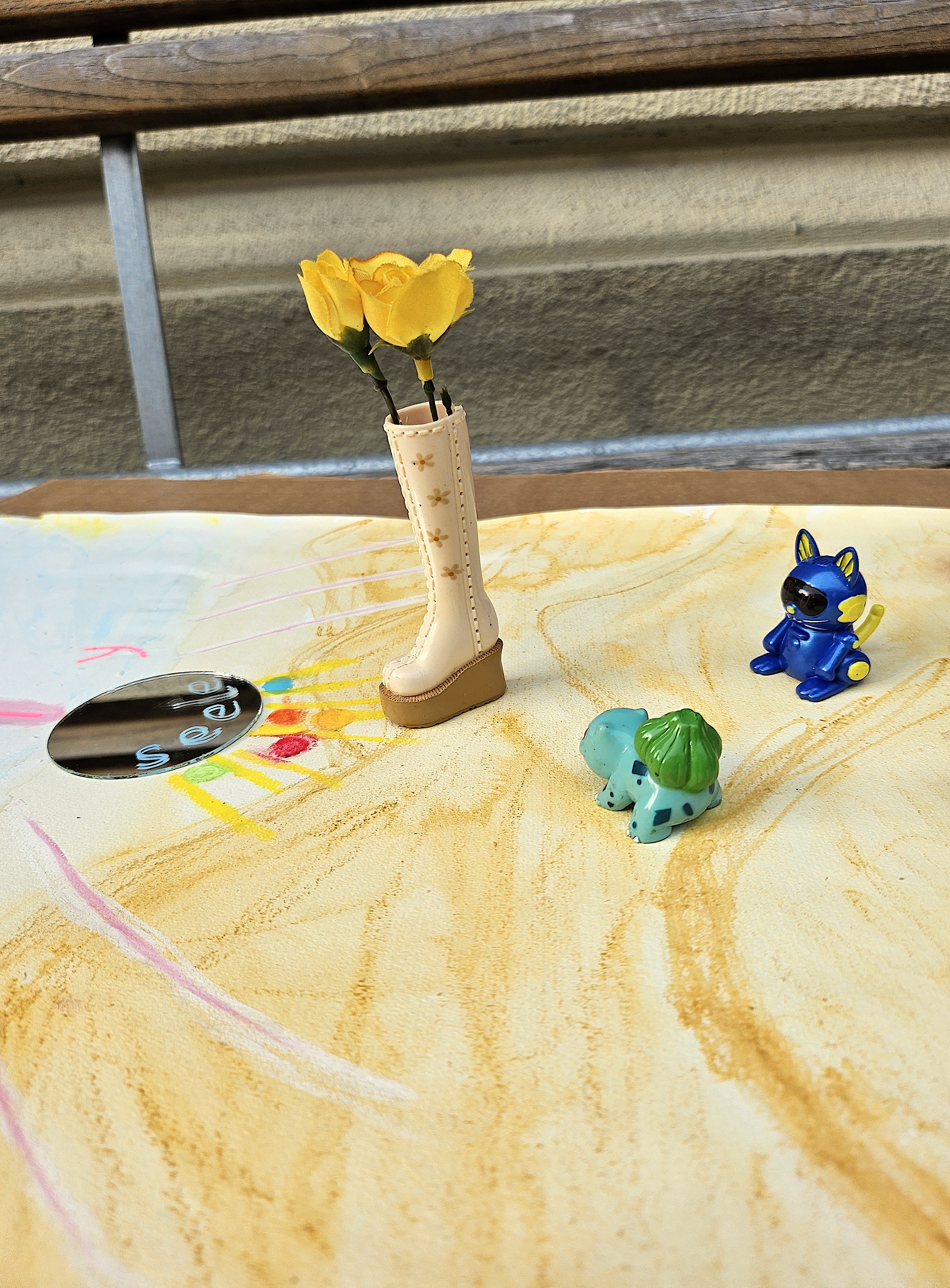 Yesterday, I went to the Migros Museum. There, they suggested some materials and a theme. And a sub-theme, something like leaving something behind or something. And something new coming. At first, I didn’t know what to do. Then, through various things, for example, I saw a small mirror in a different shape, but she didn’t want to give it to me. Instead, she suggested this round one to me. I thought she needed the round one anyway. Apparently not. And that triggered thought processes and memories in me, and something else. And then it finally turned into a creative process. And a woman brought along lots of these figures, little figurines. And without knowing why, because they fascinated me, I chose these figurines. And I put little flowers in this shoe as decoration. I didn’t know what for yet. And they ended up serving a purpose.