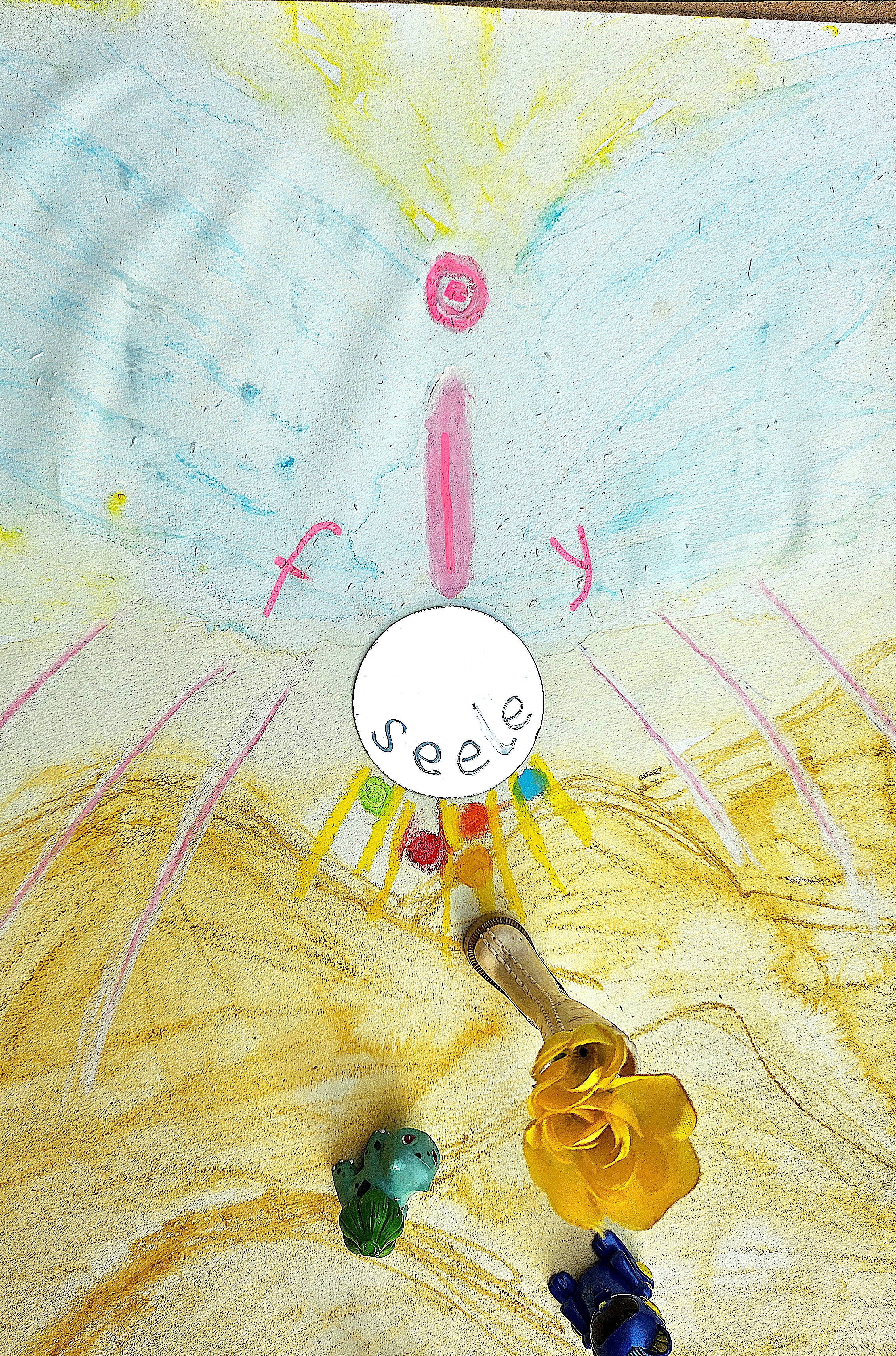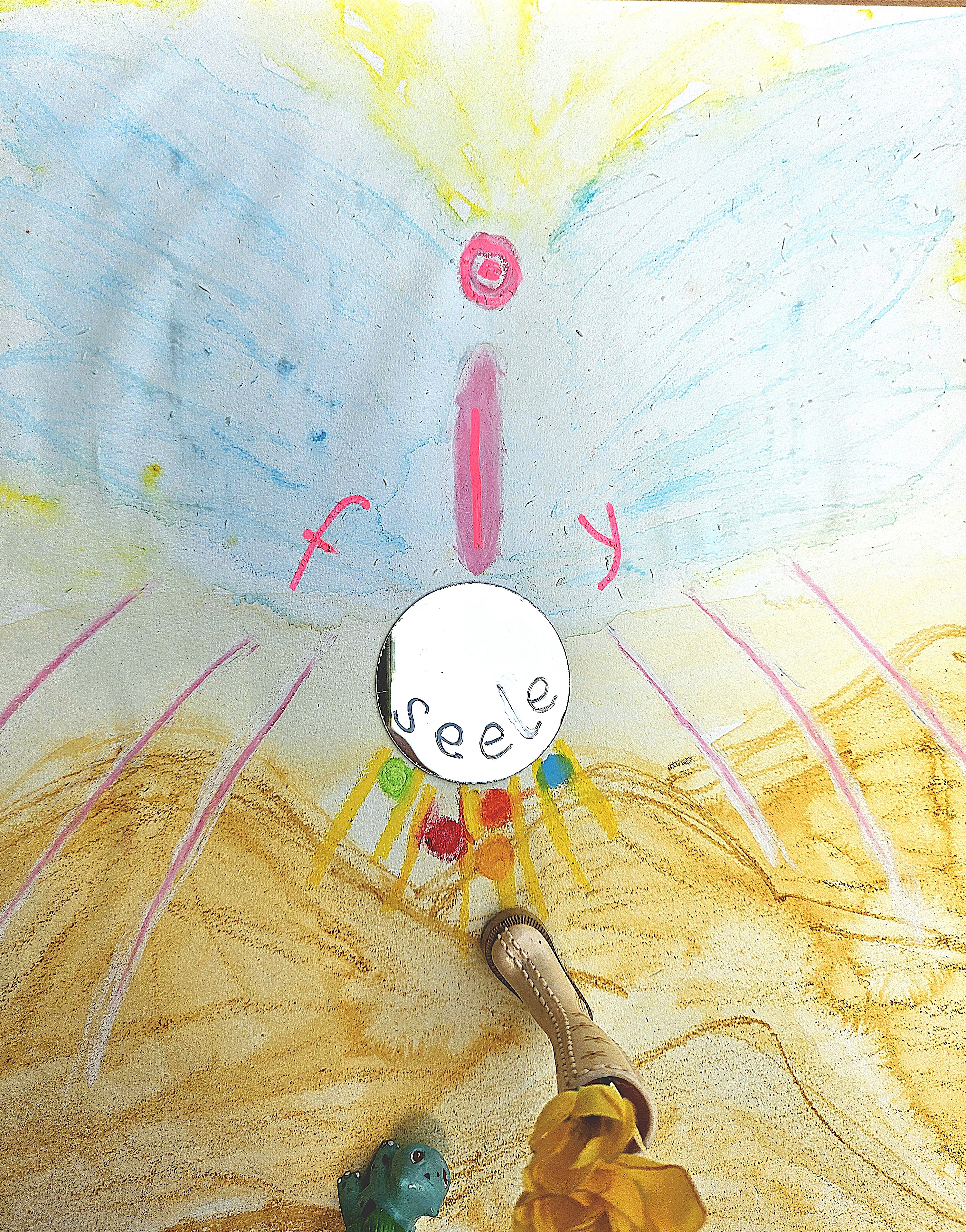 And so, after a long process, this is what emerged. There is a mirror with the word ‘soul’ (Seele) written on it. So that is my soul. It is a mirror lying on the earth, but reflecting the sky. And underneath it says ‘desert’ (Wüste) so that people understand. And somehow I wanted to use language as well. It is an almost holistic work of art, so to speak. The only thing missing is music or sound. And at the top is what people didn’t understand and then said, ‘Ah yes, when you say that, it makes sense!’ One woman said, ‘That’s genius! I fly!’ Meaning brilliant, how I put it in the picture. (I) fIy.