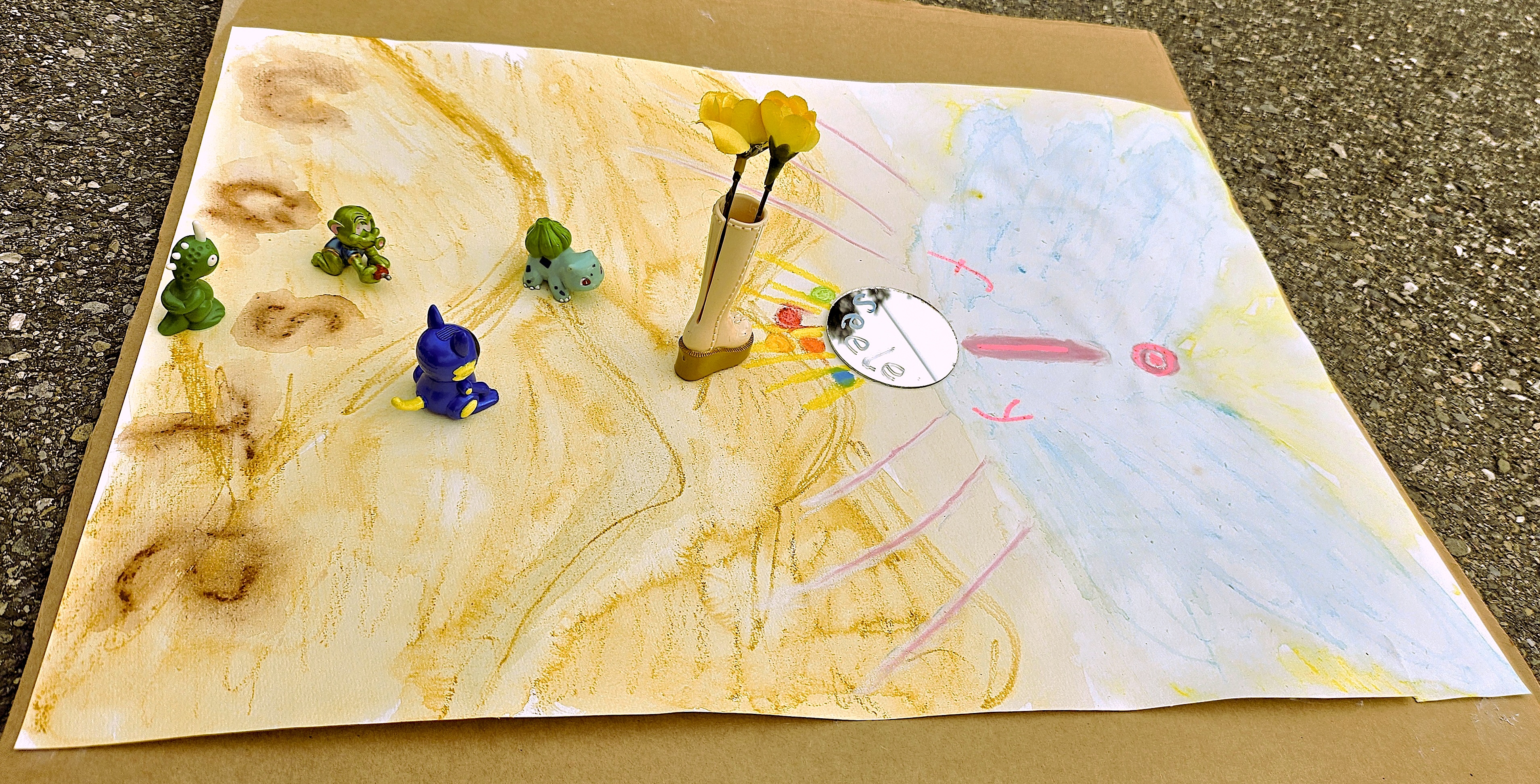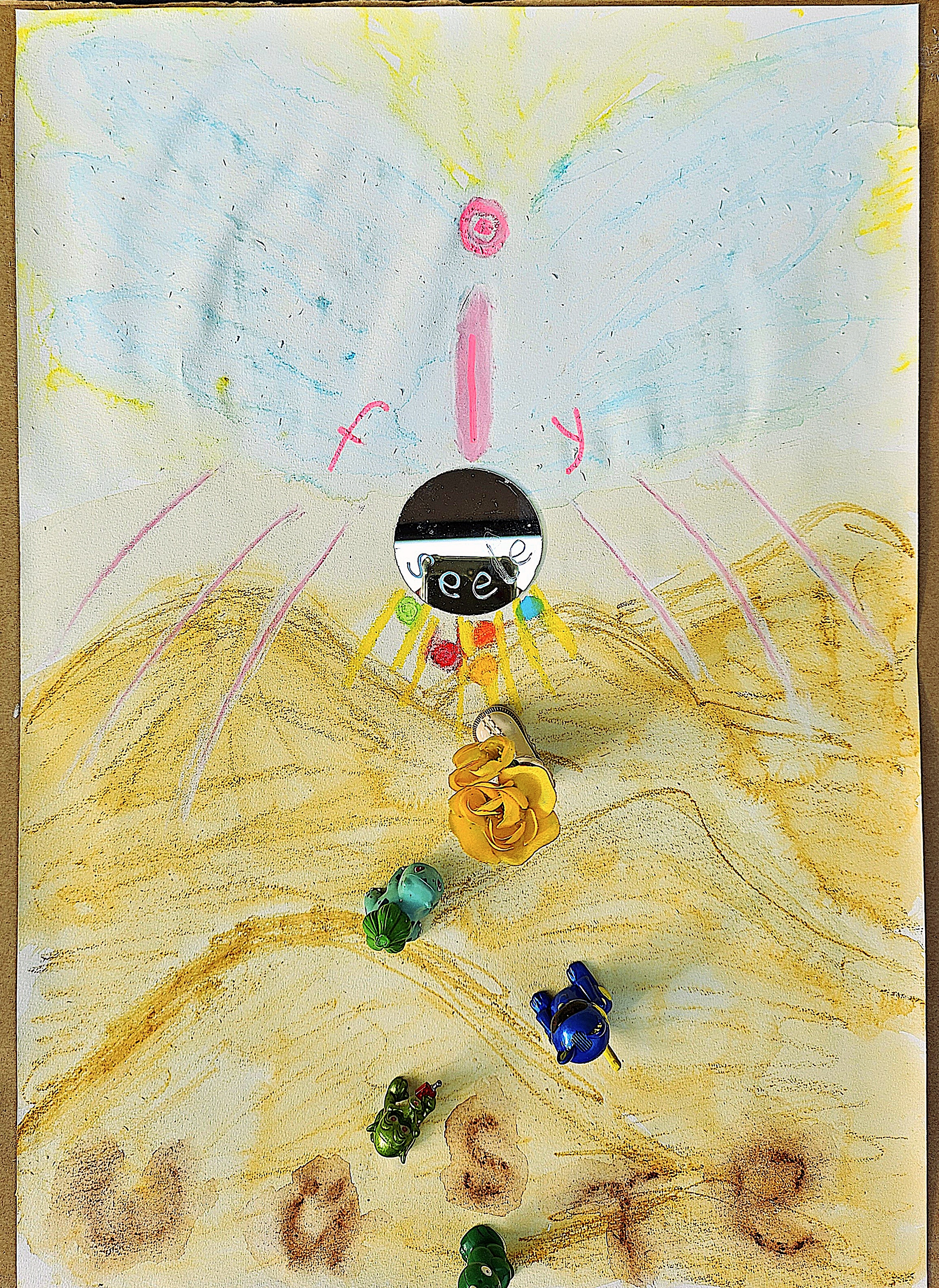 Yesterday (7.7)… again (as previous post) with a small round mirror at the bottom. Balloons – cut from paper and colored. Size 65×99 cm. On paper. The mirror (in both) = my soul: though it lies on the ground (Earth) it mirrors the SKY=MY “earth”. UNd this reflection = it is ITS CONTENT 🪽