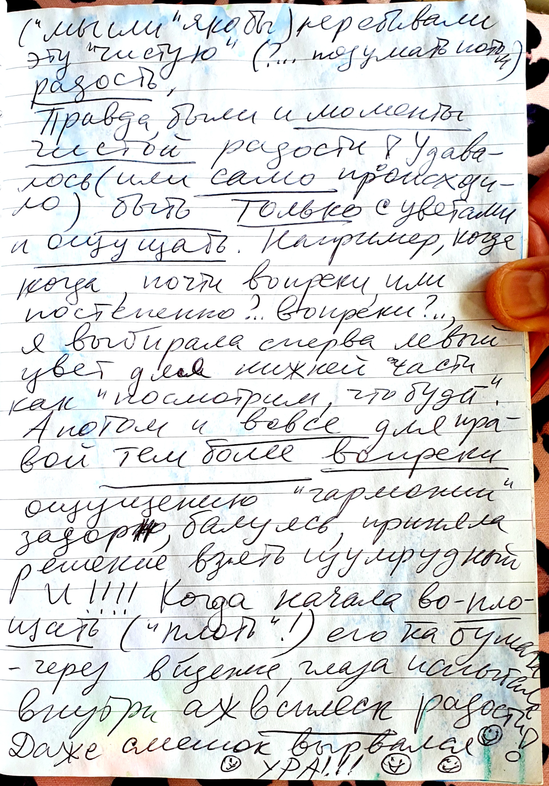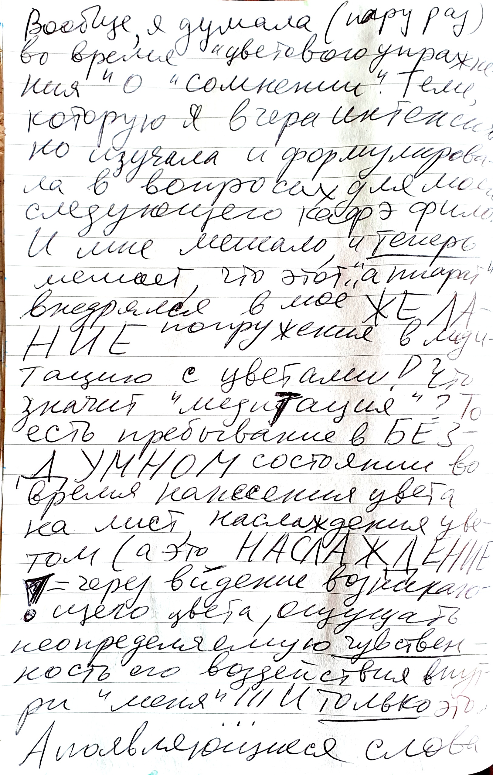 Actually, I thought (a couple of times) during the “color exercise” about “doubt”. A topic that I was intensively studying yesterday and formulating in questions for my next cafe philo. .. And it bothered me, and NOW it bothers me that this “apparatus” was intruding into my WISH to dive into meditation with colours! What does “meditation” mean? That is, being in a THOUGHTLESS state while applying color to a sheet, enjoying the color (and this is a PLEASURE! = through the vision of the emerging color to sense the undetecable SENSUALITY of its impact inside “me”!!! And ONLY this. And the words that appear(“thoughts” supposedly) interrupted this “pure” (? … think later) JOY. True, there were MOMENTS of PURE joy! It was possible (or by ITSELF happened) TO BE ONLY with colours and SENSE. For example, when when, almost in spite of, or gradually? .. contrary to? .., I first chose the left color for the lower part as “we’ll see what happens.” And then AT ALL, for the right one ALL THE MORE CONTRARY to the feeling of “harmony”, perky, dabbling, decided to take the emerald color AND !!! When I started to EM-BODY (“body”!) it on paper – through the vision/eyes I experienced inside as much a SPLASH of joy! Even a chuckle escaped! HOORAY!!!